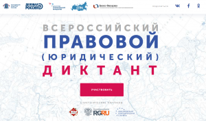 С 3 по 10 декабря 2018 года для всех граждан страны в возрасте от 14 лет в онлайн режиме на официальном портале https://юрдиктант.рф организован Всероссийский правовой (юридический) диктант. Диктант проводится с целью оценки уровня правовой грамотности населения. Основные задачи диктанта – повышение мотивации различных слоев населения в изучении права, знание которого является неотъемлемой составляющей образованного человека, получение объективной информации об уровне правовой грамотности населения России с учетом его возрастной и социальной структуры, привлечение средств массовой информации и российского общества к вопросу повышения уровня правовой культуры населения, выработка предложений по повышению образовательных программ.