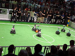Роботы в ежегодном турнире RoboCup соревнуются в упрощённой форме футбола. сайт cibernetika.ru
